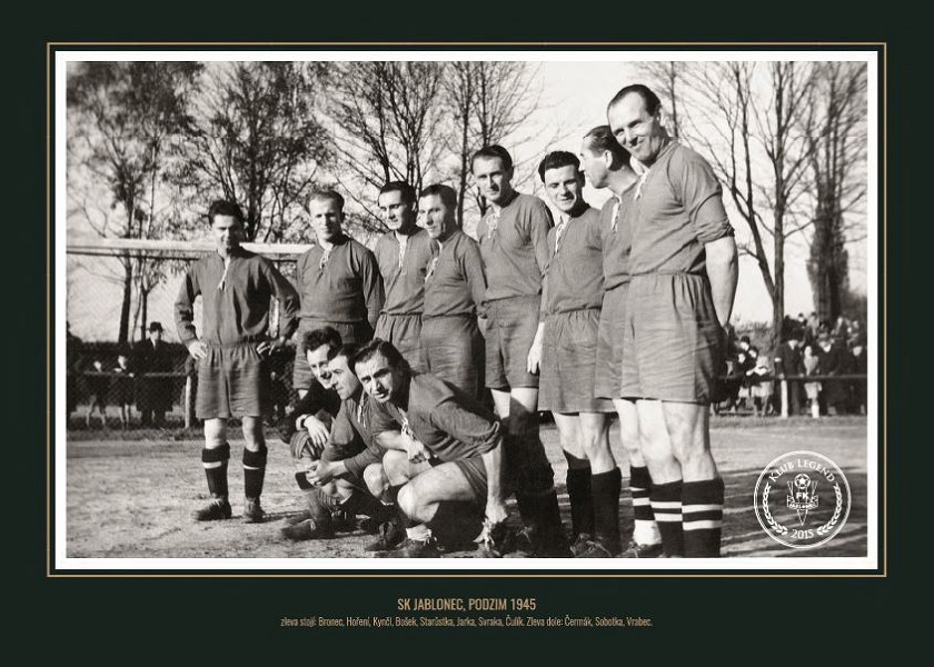 1. Nejstarší dochovaná týmová fotografie zachycuje mužstvo SK Jablonec z roku 1945.
