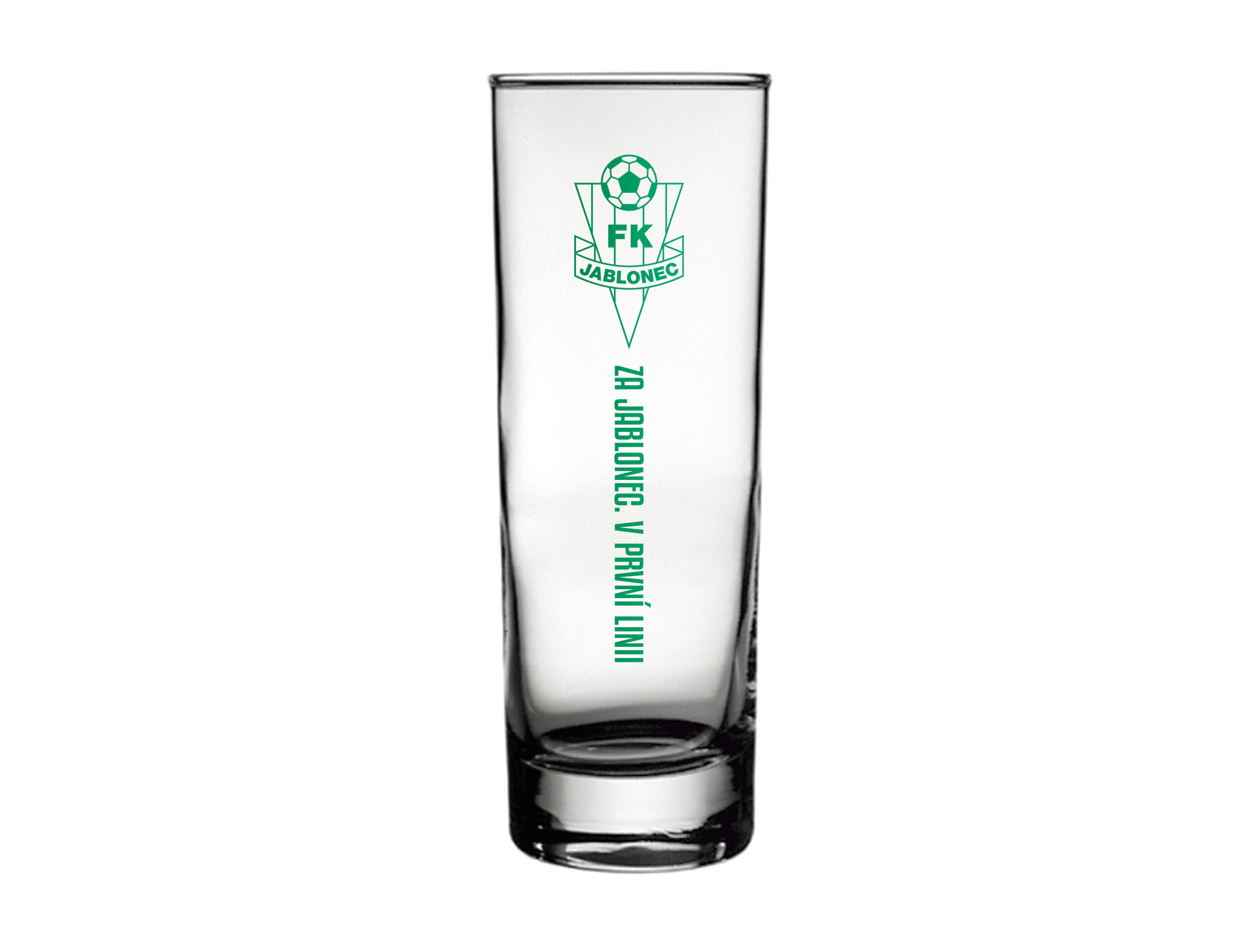 Stylová sklenice z hladkého čirého skla s klubovým potiskem, vhodná pro podávání a konzumaci alkoholických koktejlů, míchaných drinků i nealkoholických nápojů.