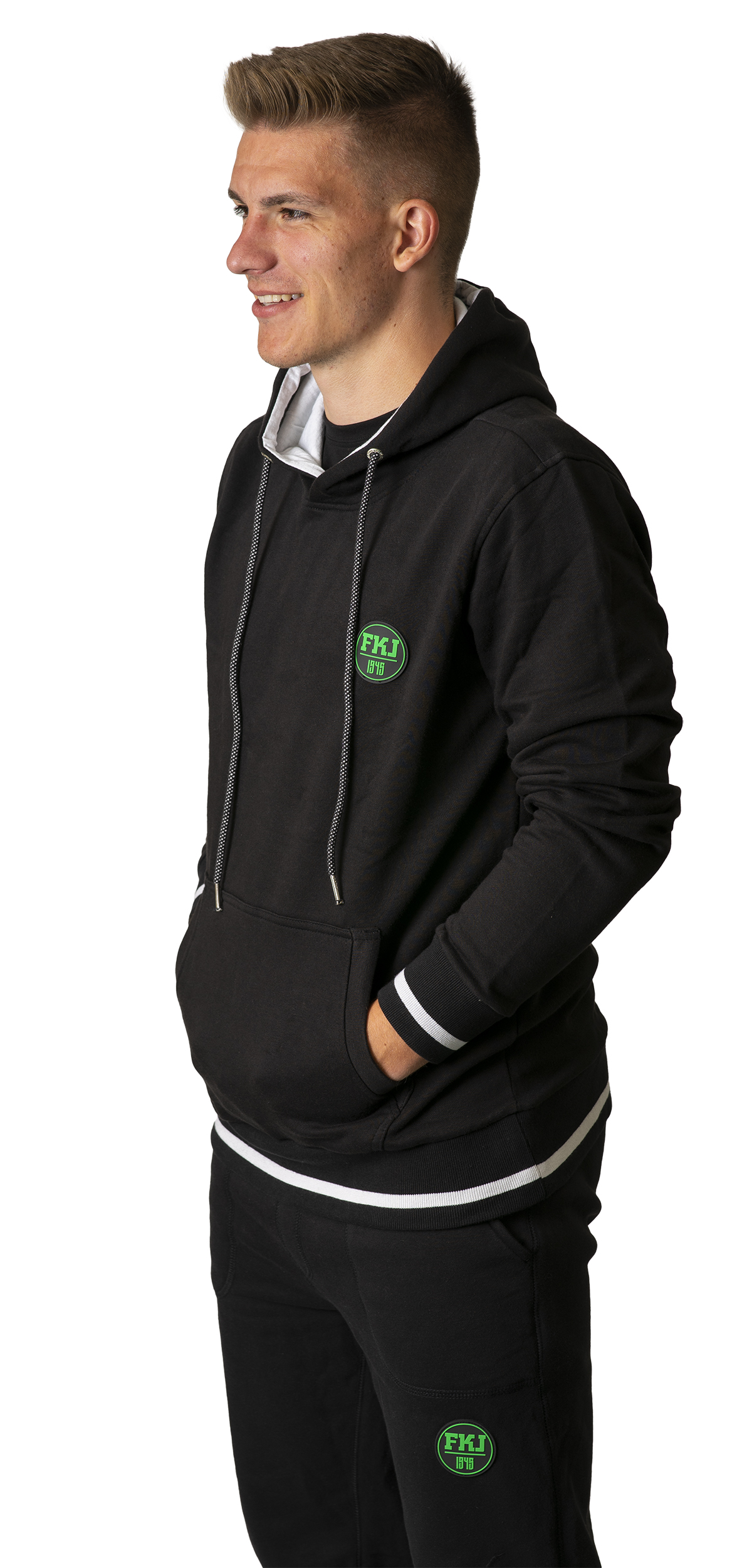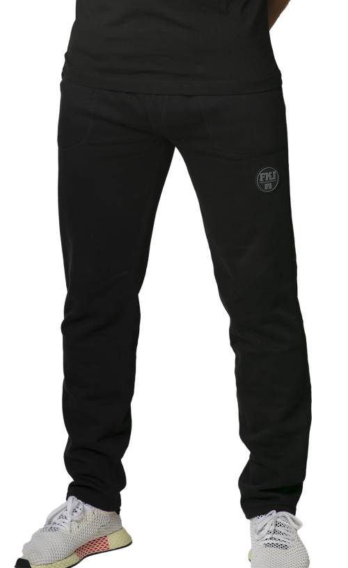 Černé pánské tepláky s bílým lemováním, v pase na gumu, dolní okraj nohavic na gumu, dvě kapsy.