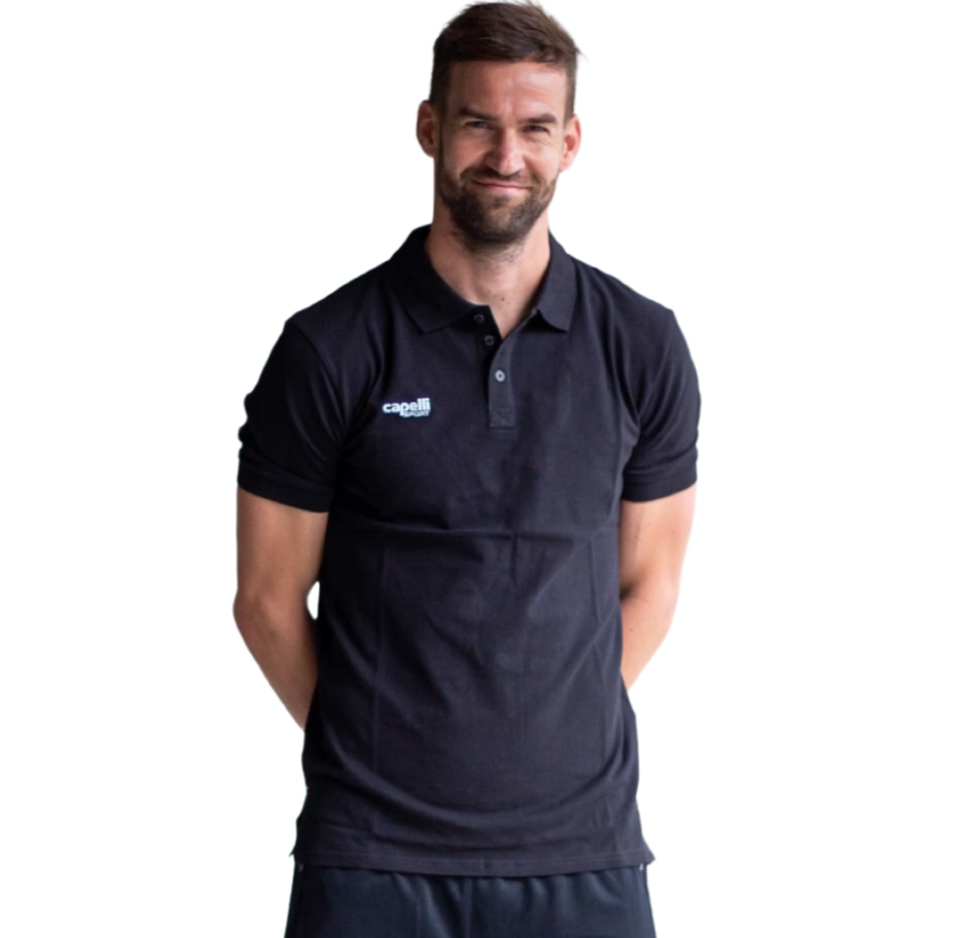 Elegantní černé tričko s límečkem a decentním bílým nápisem Capelli na pravé straně můžete využít i na slavnostnější příležitosti, do práce nebo jen tak na ven.