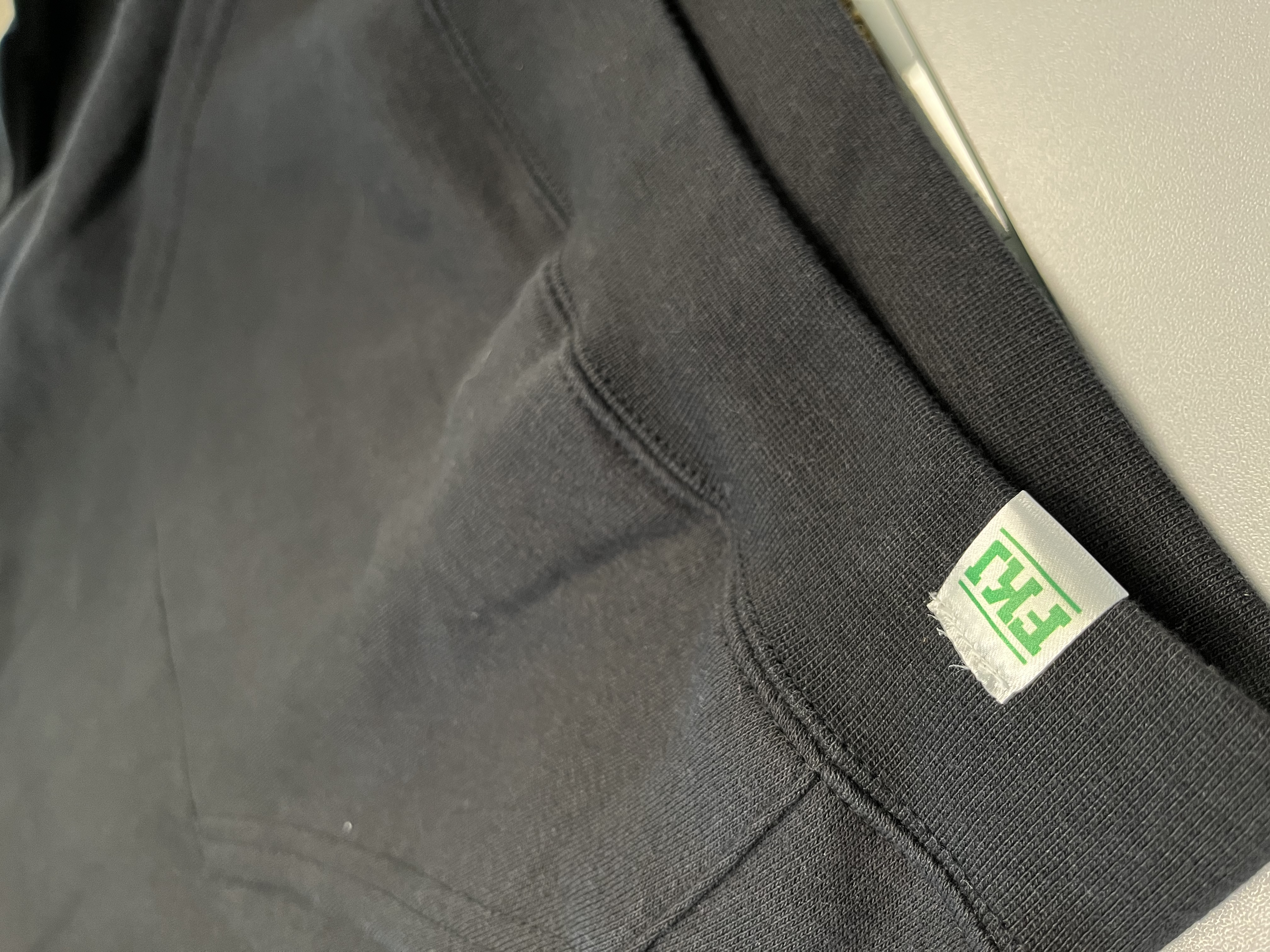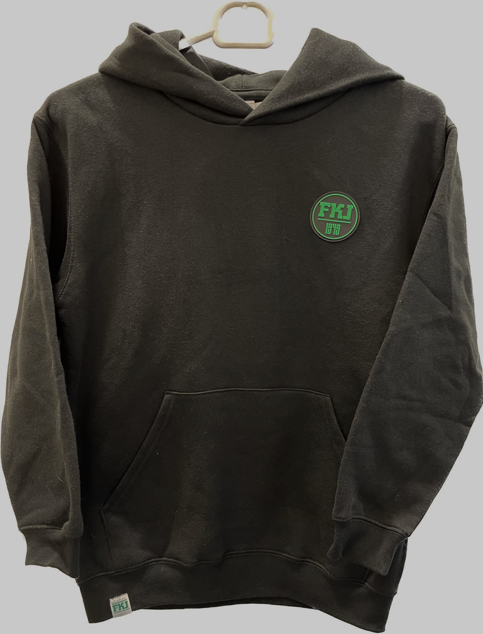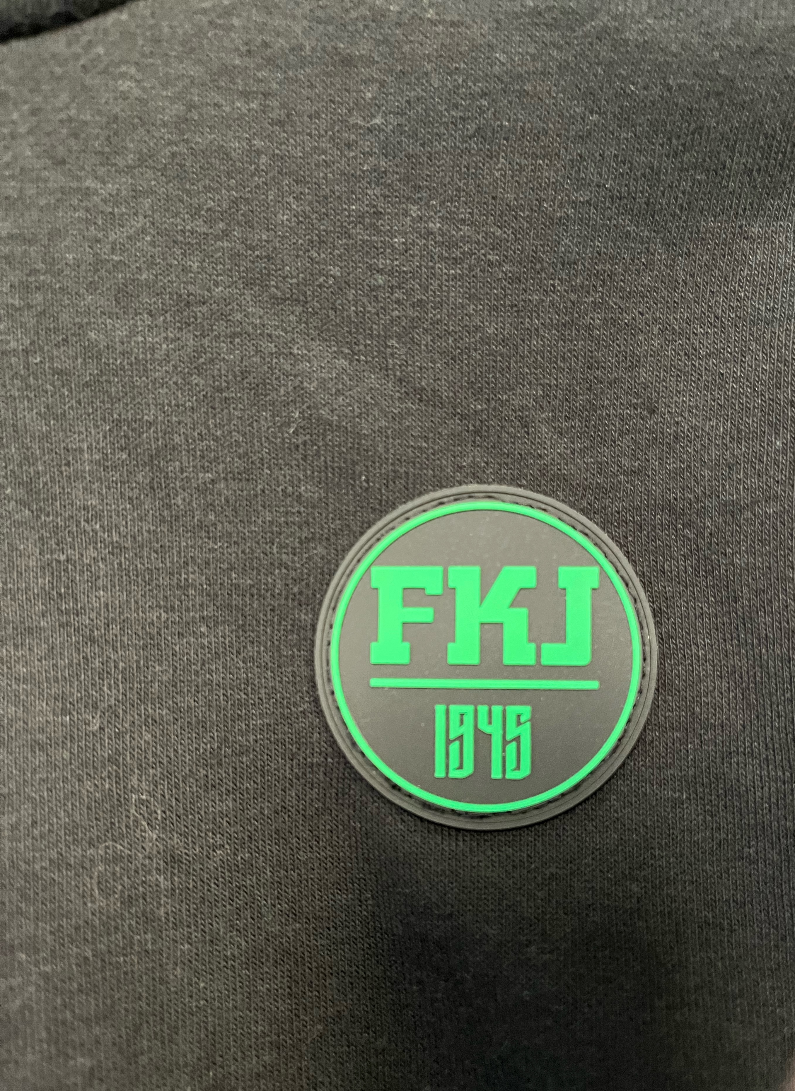 Mikina má na sobě našitou černozelenou gumovou nášivku FKJ 1945.