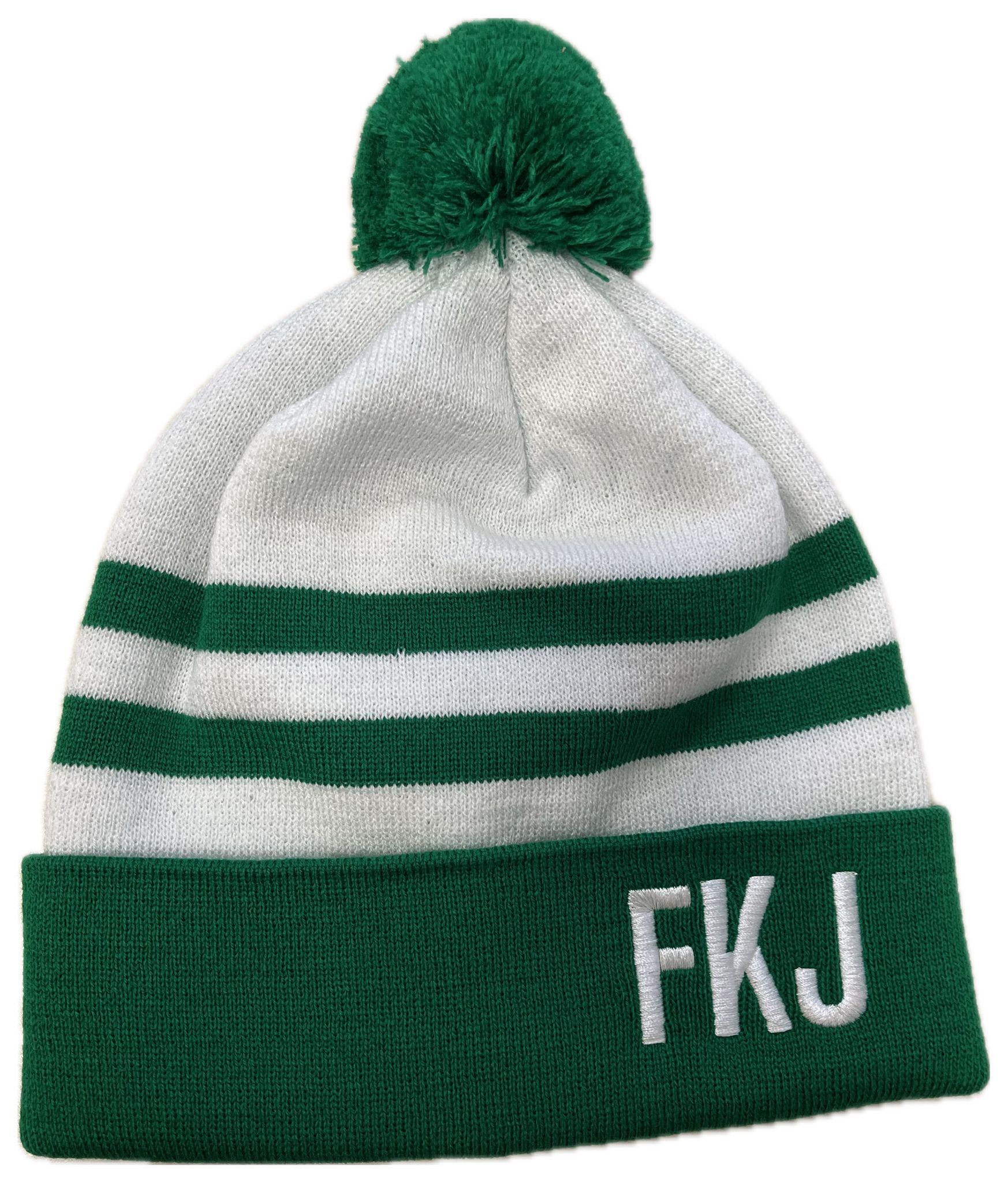 Zelenobílý kulich s vypleteným FKJ a bambulí. Kulich je z jemné pleteniny. Velikost je univerzální. Unisex. Materiál: 100% akryl.