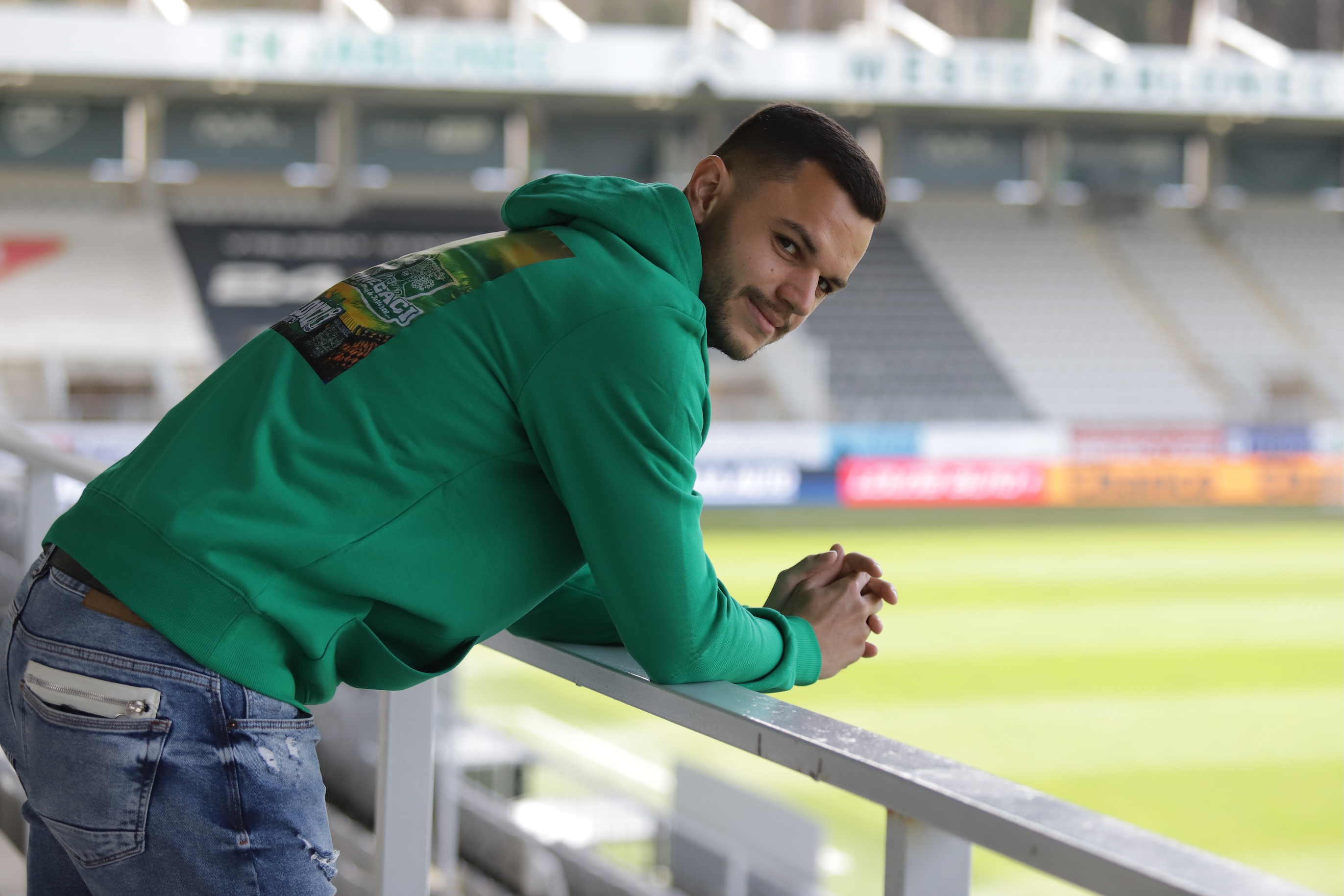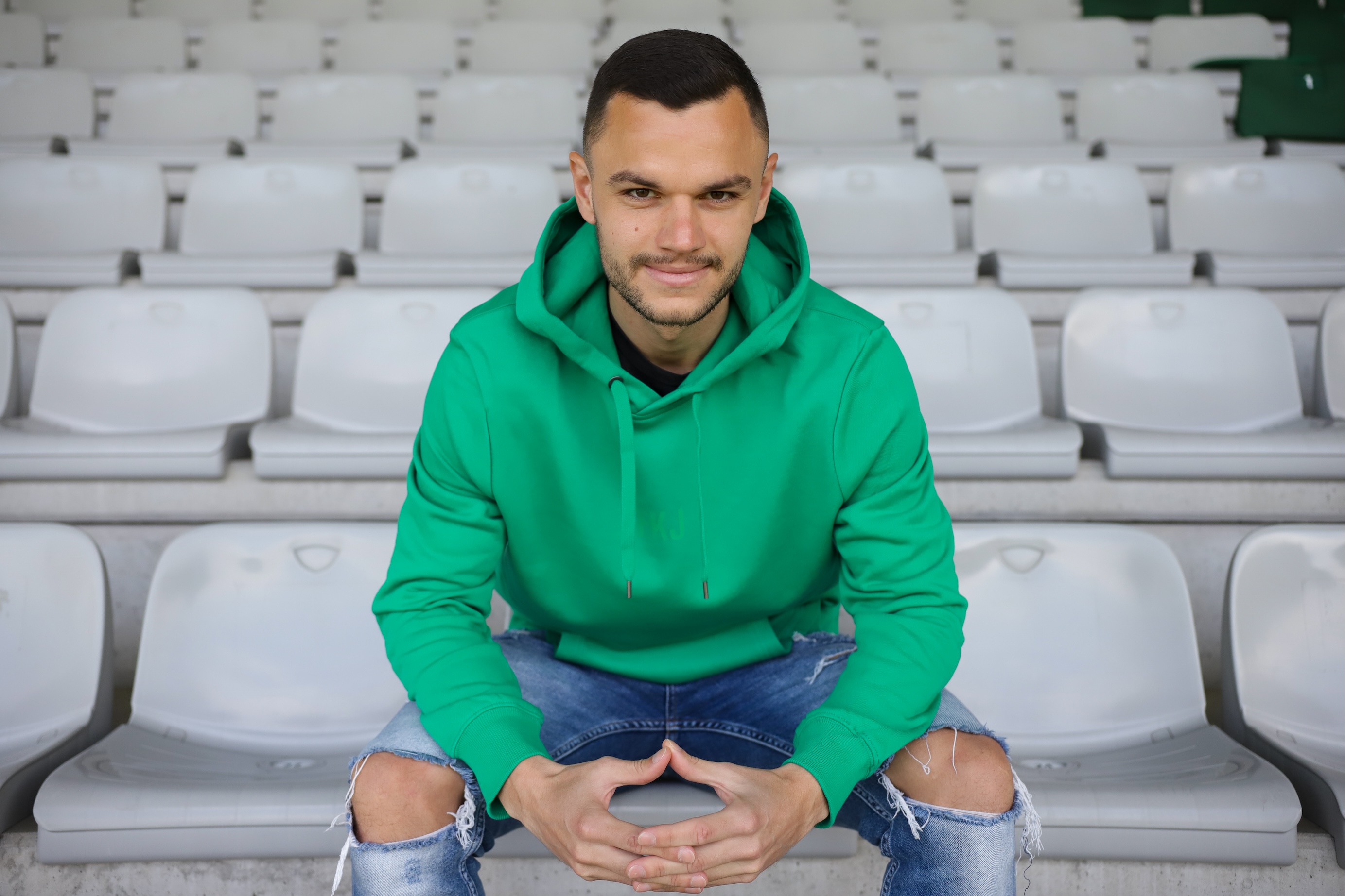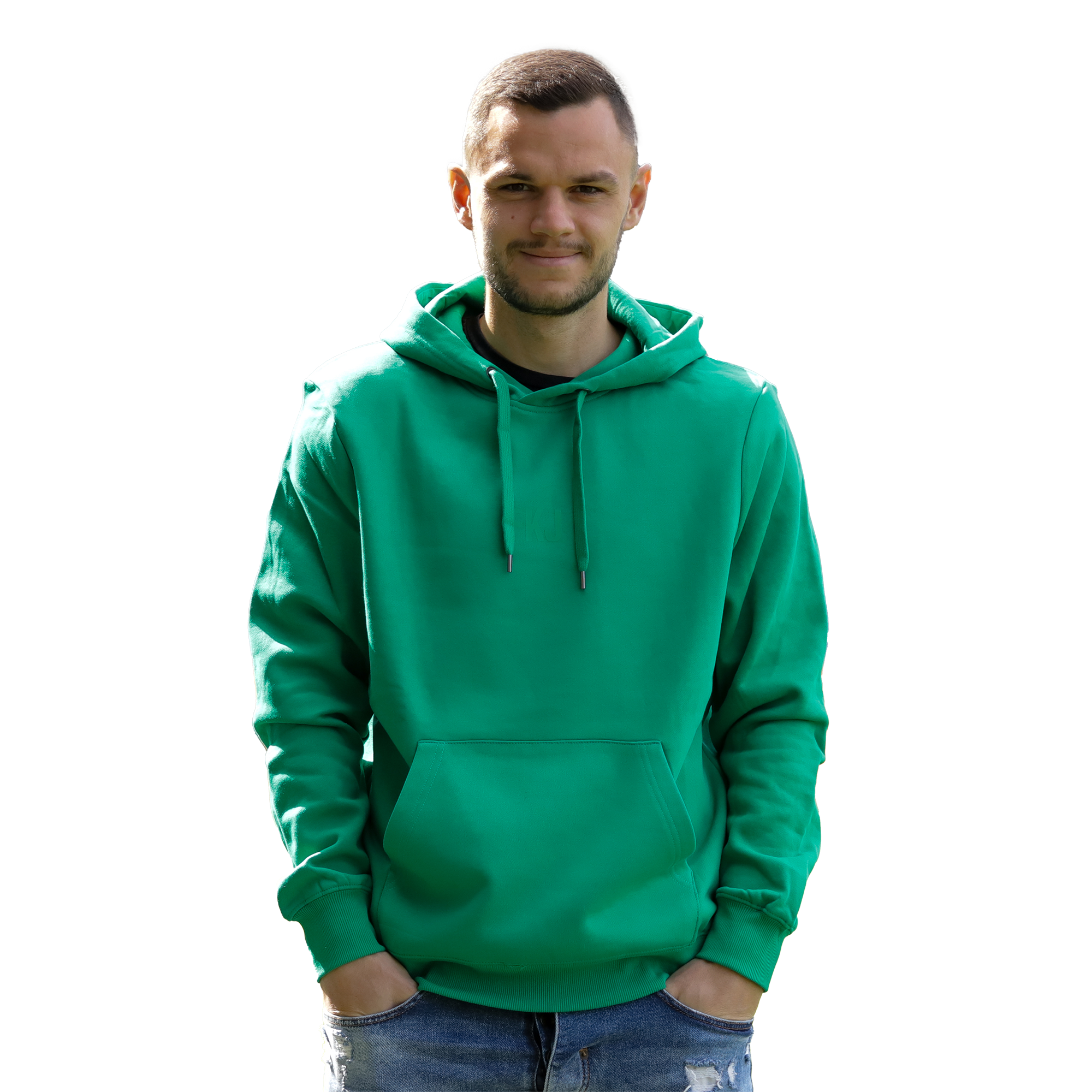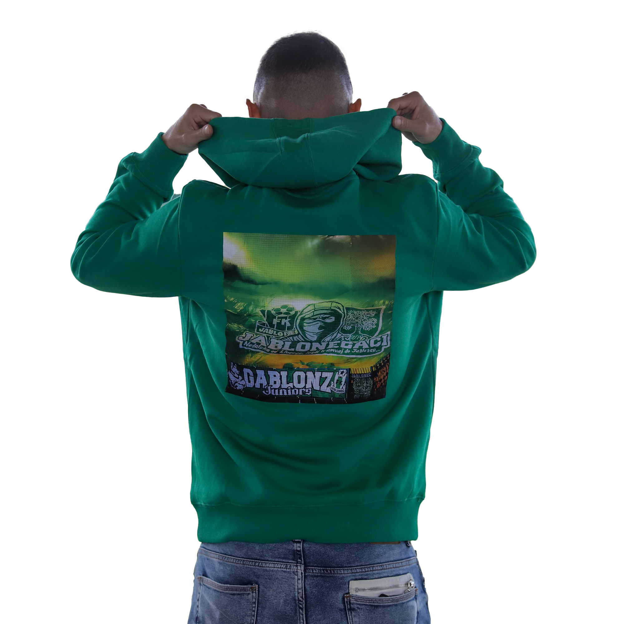 Zelená mikina s decentním nápisem vpředu a velkým potiskem fanoušků na zádech.